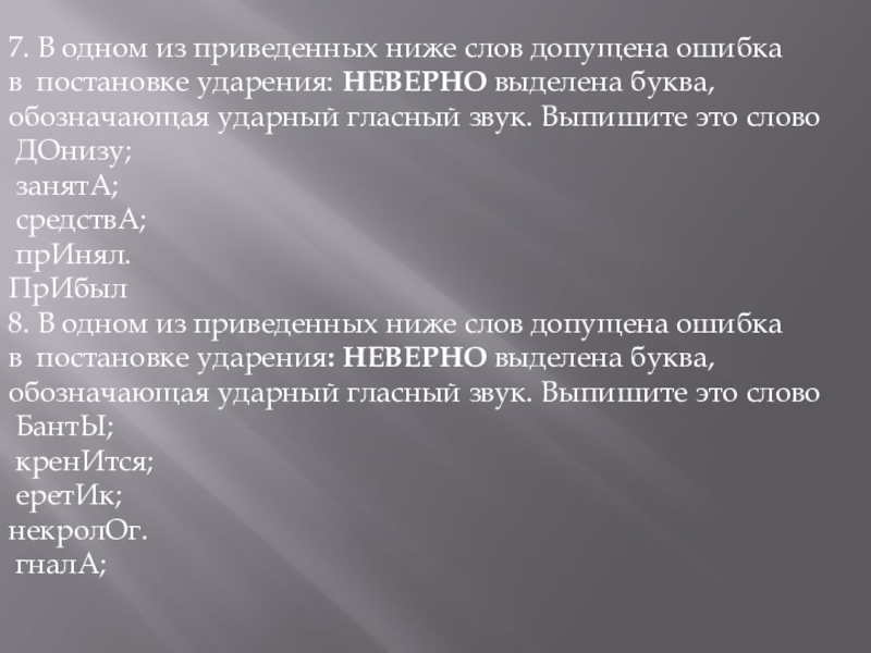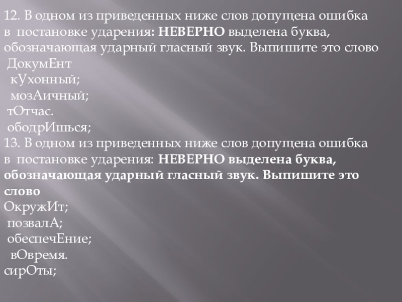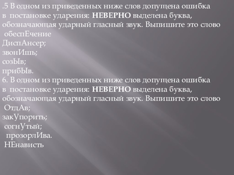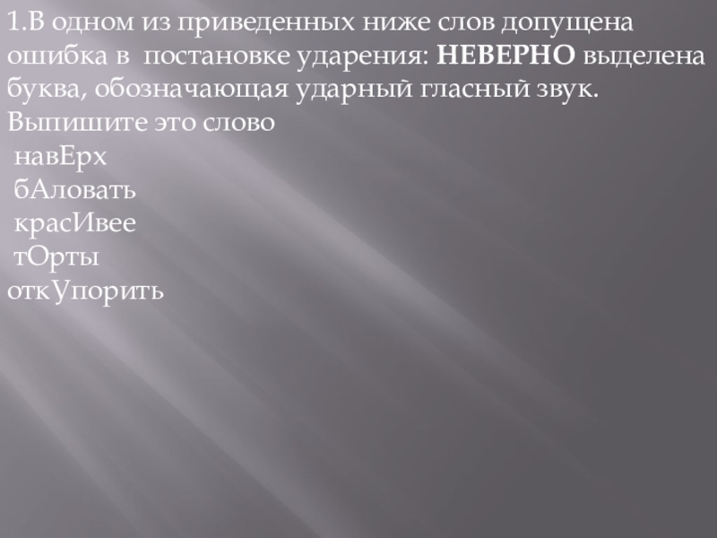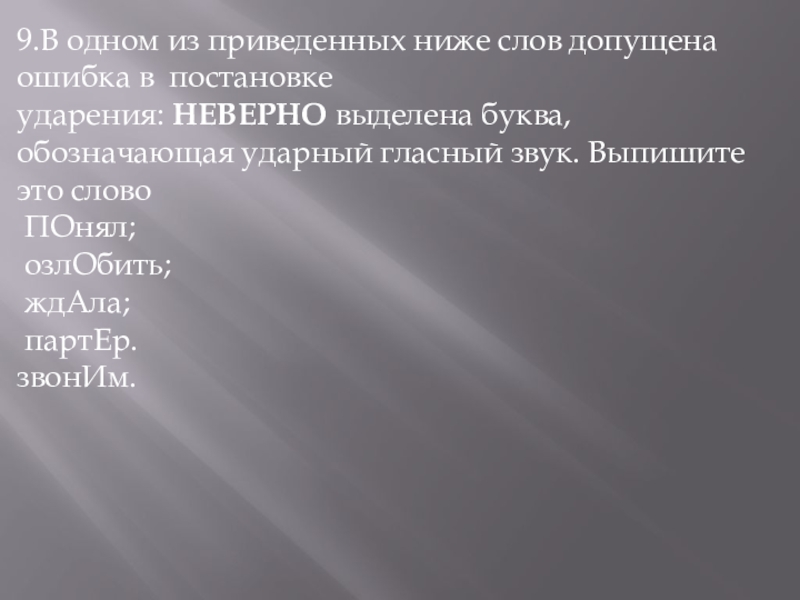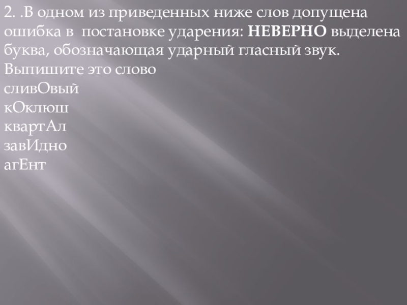 Слайд 259.В одном из приведенных ниже слов допущена ошибка в постановке ударения: НЕВЕРНО выделена