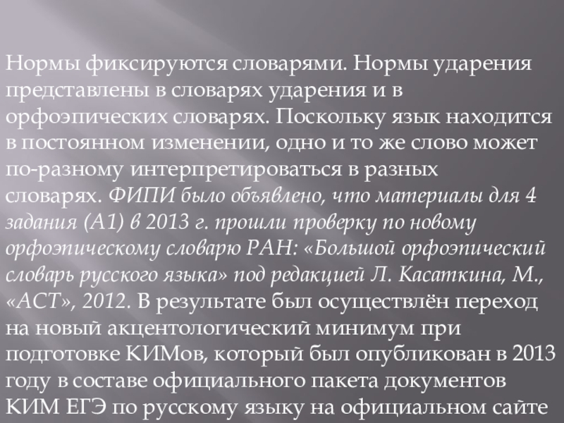 орфоэпических словарях. Поскольку язык находится в постоянном изменении, одно и то же слово может по-разному интерпретироваться в разных словарях. ФИПИ было объявлено, что материалы для 4 задания (А1) в 2013 г. прошли проверку по новому орфоэпическому словарю РАН: «Большой орфоэпический словарь русского языка» под редакцией Л. Касаткина, М., «АСТ», 2012. В результате был осуществлён переход на новый акцентологический минимум при подготовке КИМов, который был опубликован в 2013 году в составе официального пакета документов КИМ ЕГЭ по русскому языку на официальном сайте ФИПИ.