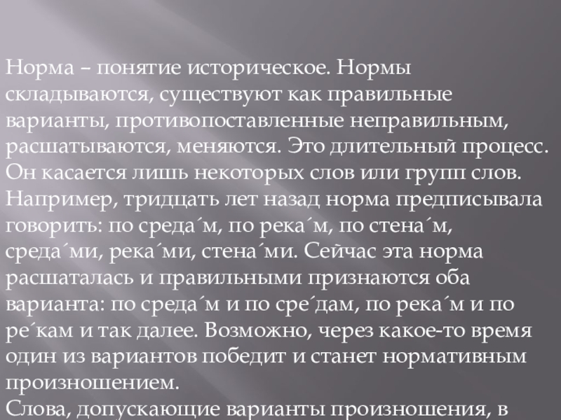 неправильным, расшатываются, меняются. Это длительный процесс. Он касается лишь некоторых слов или групп слов. Например, тридцать лет назад норма предписывала говорить: по среда´м, по река´м, по стена´м, среда´ми, река´ми, стена´ми. Сейчас эта норма расшаталась и правильными признаются оба варианта: по среда´м и по сре´дам, по река´м и по ре´кам и так далее. Возможно, через какое-то время один из вариантов победит и станет нормативным произношением.