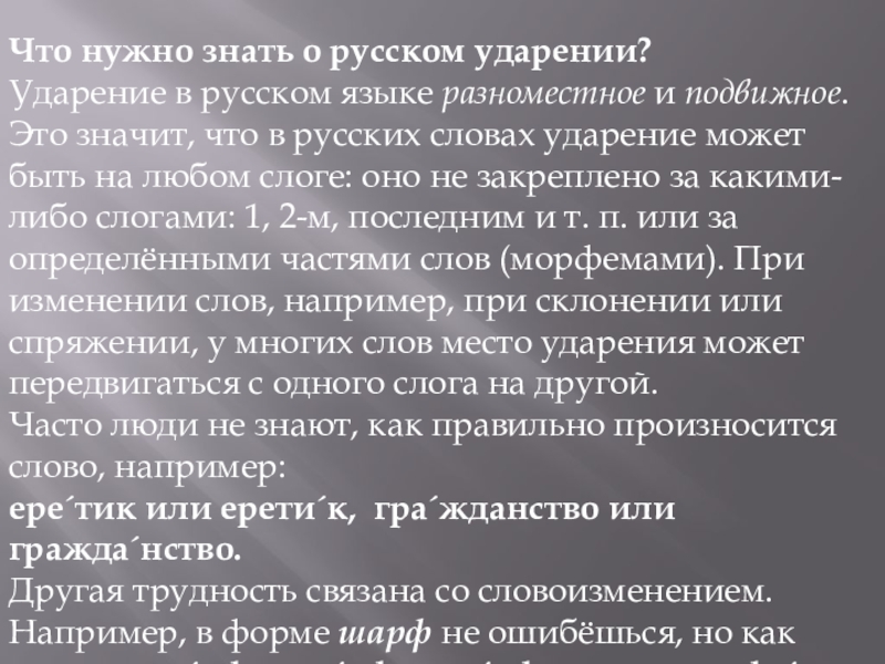 что в русских словах ударение может быть на любом слоге: оно не закреплено за какими-либо слогами: 1, 2-м, последним и т. п. или за определёнными частями слов (морфемами). При изменении слов, например, при склонении или спряжении, у многих слов место ударения может передвигаться с одного слога на другой.