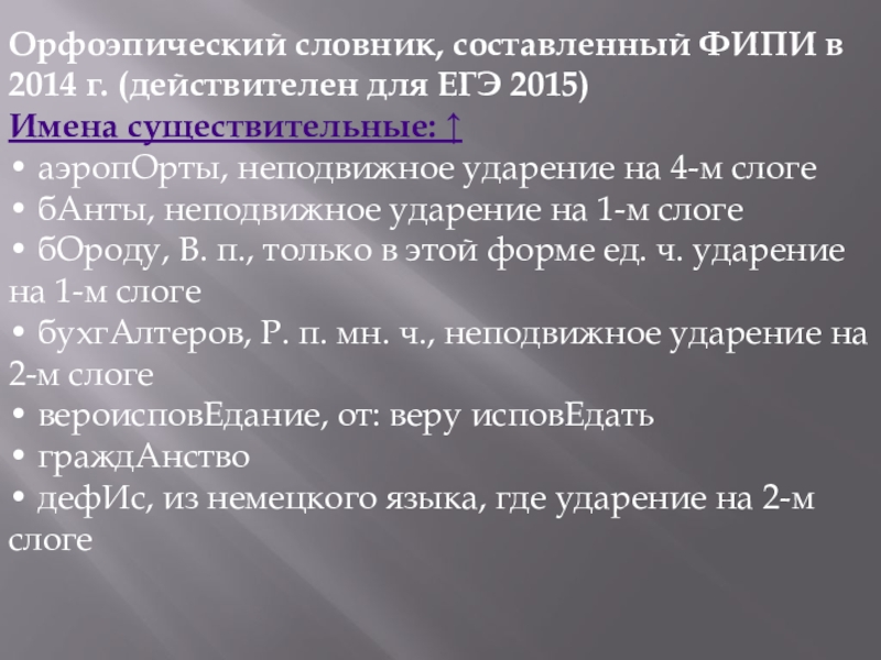 Слайд 5Орфоэпический словник, составленный ФИПИ в 2014 г. (действителен для ЕГЭ 2015)