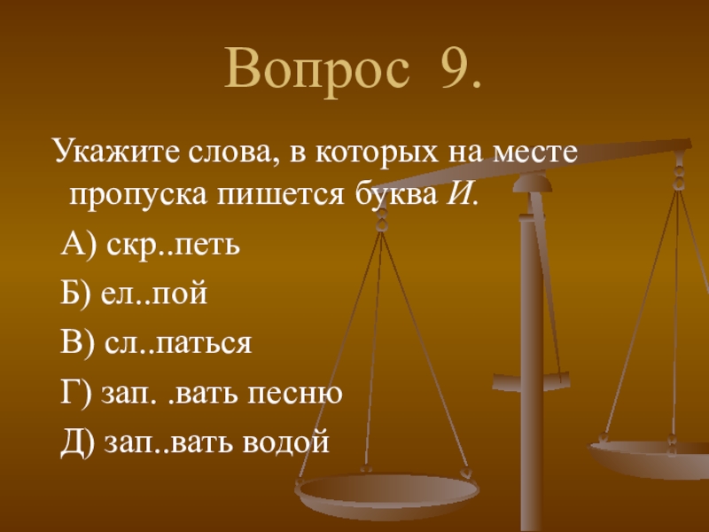 Вопрос 9. Укажите слова, в которых на месте пропуска пишется буква И. А) скр..петь
