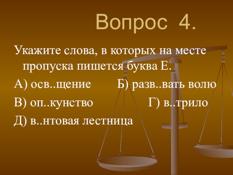 Вопрос 4.Укажите слова, в которых на месте пропуска пишется буква Е.А) осв..щение