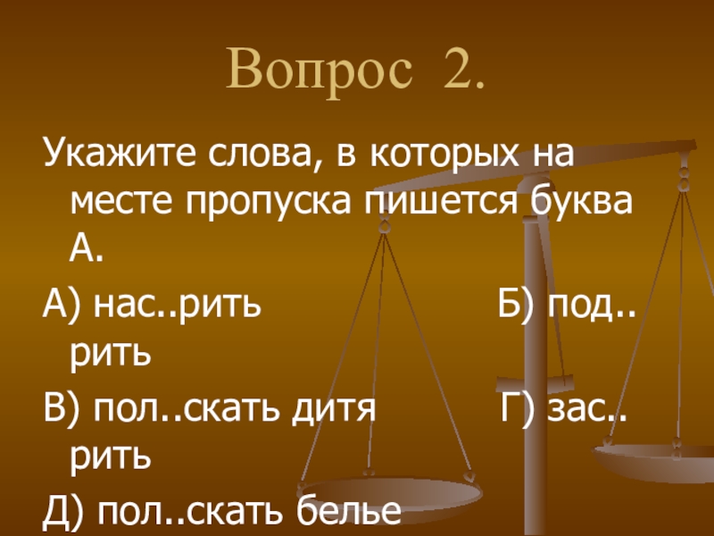 Вопрос 2.Укажите слова, в которых на месте пропуска пишется буква А.А) нас..рить