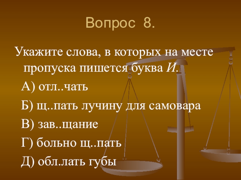 Вопрос 8.Укажите слова, в которых на месте пропуска пишется буква И. А) отл..чать