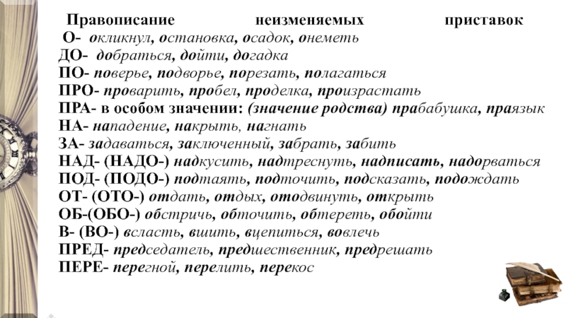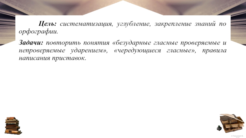 понятия «безударные гласные проверяемые и непроверяемые ударением», «чередующиеся гласные», правила написания приставок.