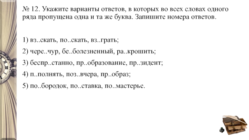Слайд 28№ 12. Укажите варианты ответов, в которых во всех словах одного