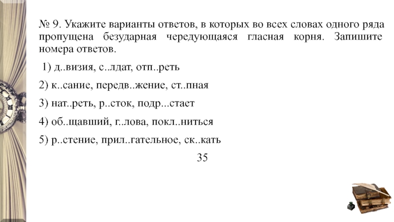 Слайд 25№ 9. Укажите варианты ответов, в которых во всех словах одного