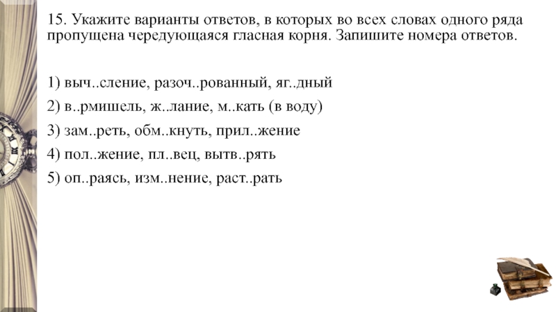 Слайд 3115. Укажите варианты ответов, в которых во всех словах одного ряда