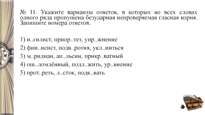 Слайд 27№ 11. Укажите варианты ответов, в которых во всех словах одного