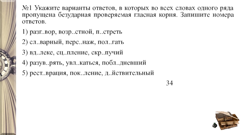 Слайд 34№ 18. Укажите варианты ответов, в которых во всех словах одного