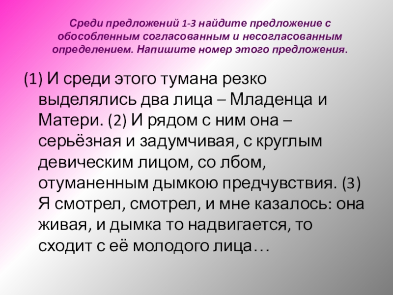 (1) И среди этого тумана резко выделялись два лица – Младенца и Матери. (2) И рядом с ним она – серьёзная и задумчивая, с круглым девическим лицом, со лбом, отуманенным дымкою предчувствия. (3) Я смотрел, смотрел, и мне казалось: она живая, и дымка то надвигается, то сходит с её молодого лица…