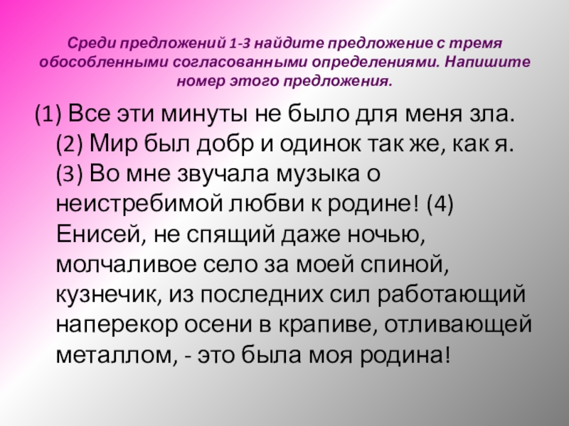 (1) Все эти минуты не было для меня зла. (2) Мир был добр и одинок так же, как я. (3) Во мне звучала музыка о неистребимой любви к родине! (4) Енисей, не спящий даже ночью, молчаливое село за моей спиной, кузнечик, из последних сил работающий наперекор осени в крапиве, отливающей металлом, - это была моя родина!