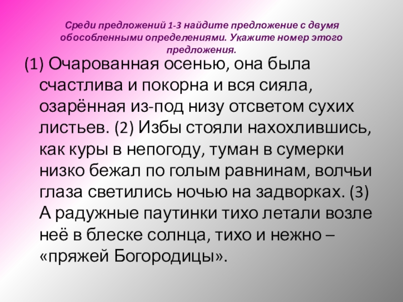 (1) Очарованная осенью, она была счастлива и покорна и вся сияла, озарённая из-под низу отсветом сухих листьев. (2) Избы стояли нахохлившись, как куры в непогоду, туман в сумерки низко бежал по голым равнинам, волчьи глаза светились ночью на задворках. (3) А радужные паутинки тихо летали возле неё в блеске солнца, тихо и нежно – «пряжей Богородицы».