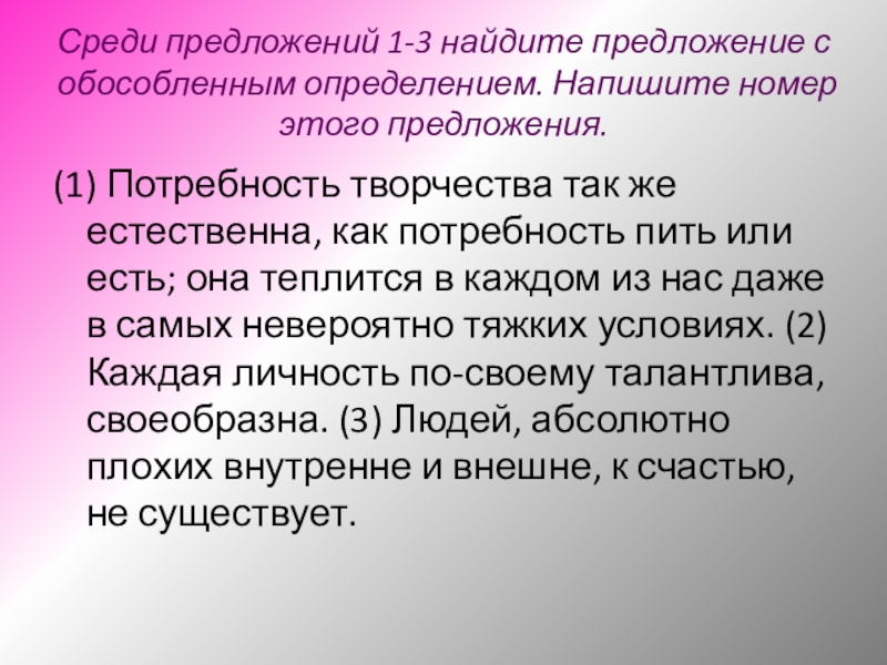 (1) Потребность творчества так же естественна, как потребность пить или есть; она теплится в каждом из нас даже в самых невероятно тяжких условиях. (2) Каждая личность по-своему талантлива, своеобразна. (3) Людей, абсолютно плохих внутренне и внешне, к счастью, не существует.