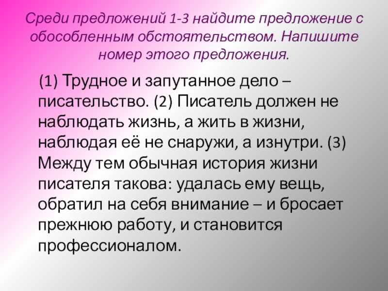 (1) Трудное и запутанное дело – писательство. (2) Писатель должен не наблюдать жизнь, а жить в жизни, наблюдая её не снаружи, а изнутри. (3) Между тем обычная история жизни писателя такова: удалась ему вещь, обратил на себя внимание – и бросает прежнюю работу, и становится профессионалом.