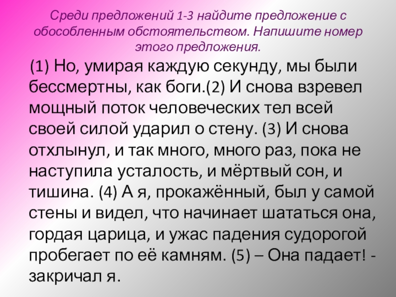 (1) Но, умирая каждую секунду, мы были бессмертны, как боги.(2) И снова взревел мощный поток человеческих тел всей своей силой ударил о стену. (3) И снова отхлынул, и так много, много раз, пока не наступила усталость, и мёртвый сон, и тишина. (4) А я, прокажённый, был у самой стены и видел, что начинает шататься она, гордая царица, и ужас падения судорогой пробегает по её камням. (5) – Она падает! - закричал я.