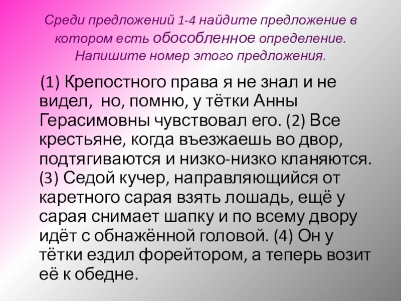 (1) Крепостного права я не знал и не видел, но, помню, у тётки Анны Герасимовны чувствовал его. (2) Все крестьяне, когда въезжаешь во двор, подтягиваются и низко-низко кланяются. (3) Седой кучер, направляющийся от каретного сарая взять лошадь, ещё у сарая снимает шапку и по всему двору идёт с обнажённой головой. (4) Он у тётки ездил форейтором, а теперь возит её к обедне.