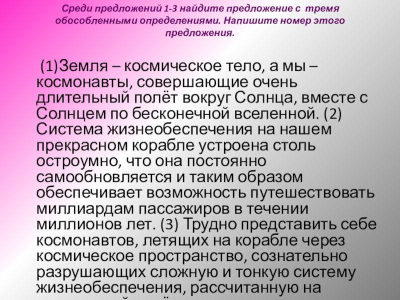 (1)Земля – космическое тело, а мы – космонавты, совершающие очень длительный полёт вокруг Солнца, вместе с Солнцем по бесконечной вселенной. (2) Система жизнеобеспечения на нашем прекрасном корабле устроена столь остроумно, что она постоянно самообновляется и таким образом обеспечивает возможность путешествовать миллиардам пассажиров в течении миллионов лет. (3) Трудно представить себе космонавтов, летящих на корабле через космическое пространство, сознательно разрушающих сложную и тонкую систему жизнеобеспечения, рассчитанную на длительный полёт.