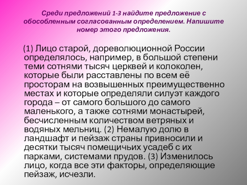 (1) Лицо старой, дореволюционной России определялось, например, в большой степени теми сотнями тысяч церквей и колоколен, которые были расставлены по всем её просторам на возвышенных преимущественно местах и которые определяли силуэт каждого города – от самого большого до самого маленького, а также сотнями монастырей, бесчисленным количеством ветряных и водяных мельниц. (2) Немалую долю в ландшафт и пейзаж страны привносили и десятки тысяч помещичьих усадеб с их парками, системами прудов. (3) Изменилось лицо, когда все эти факторы, определяющие пейзаж, исчезли.