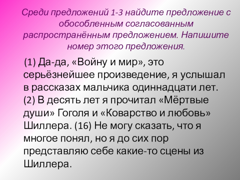 (1) Да-да, «Войну и мир», это серьёзнейшее произведение, я услышал в рассказах мальчика одиннадцати лет. (2) В десять лет я прочитал «Мёртвые души» Гоголя и «Коварство и любовь» Шиллера. (16) Не могу сказать, что я многое понял, но я до сих пор представляю себе какие-то сцены из Шиллера.