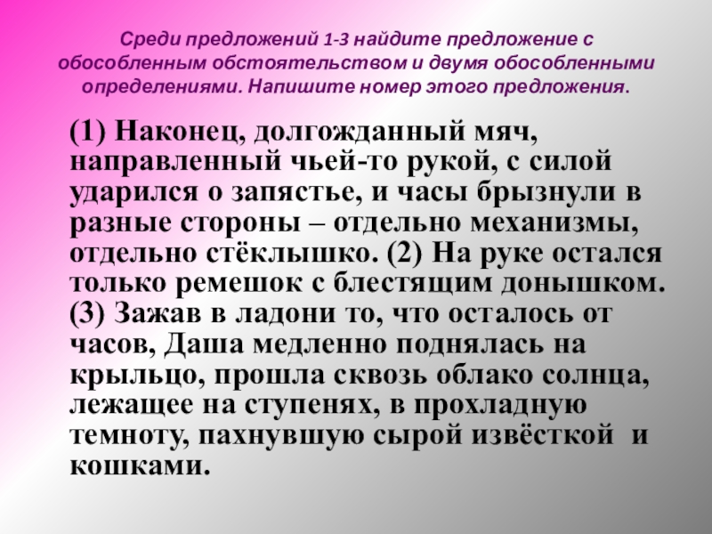 (1) Наконец, долгожданный мяч, направленный чьей-то рукой, с силой ударился о запястье, и часы брызнули в разные стороны – отдельно механизмы, отдельно стёклышко. (2) На руке остался только ремешок с блестящим донышком. (3) Зажав в ладони то, что осталось от часов, Даша медленно поднялась на крыльцо, прошла сквозь облако солнца, лежащее на ступенях, в прохладную темноту, пахнувшую сырой извёсткой и кошками.