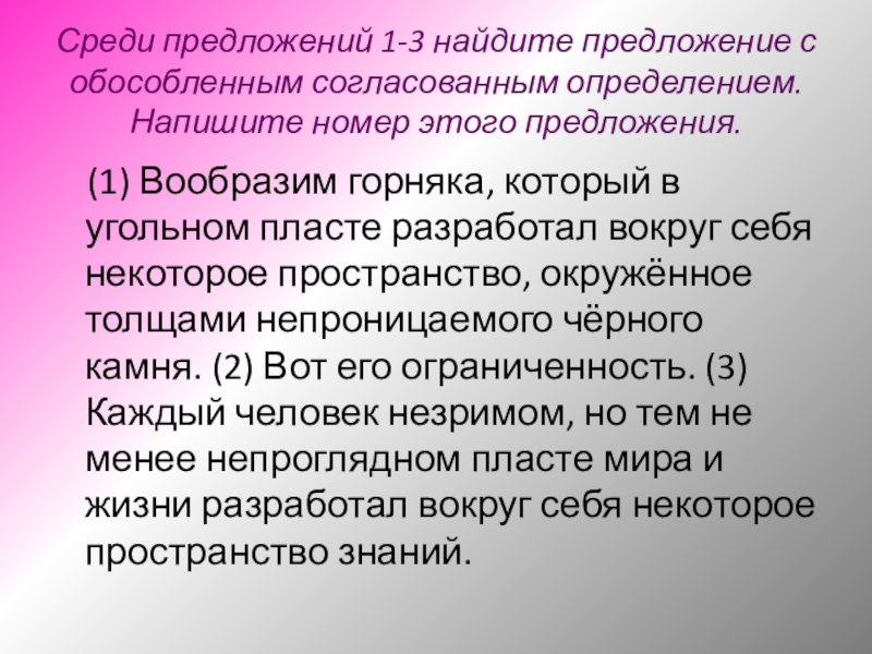 (1) Вообразим горняка, который в угольном пласте разработал вокруг себя некоторое пространство, окружённое толщами непроницаемого чёрного камня. (2) Вот его ограниченность. (3) Каждый человек незримом, но тем не менее непроглядном пласте мира и жизни разработал вокруг себя некоторое пространство знаний.