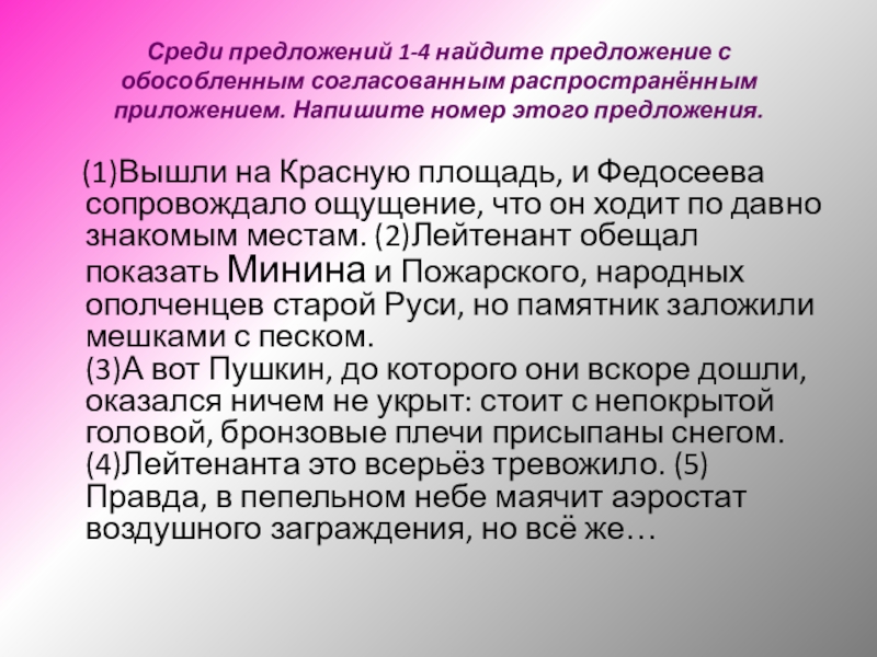 (3)А вот Пушкин, до которого они вскоре дошли, оказался ничем не укрыт: стоит с непокрытой головой, бронзовые плечи присыпаны снегом. (4)Лейтенанта это всерьёз тревожило. (5)Правда, в пепельном небе маячит аэростат воздушного заграждения, но всё же…