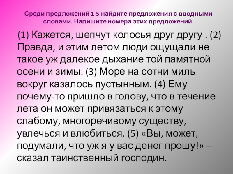 (1) Кажется, шепчут колосья друг другу . (2) Правда, и этим летом люди ощущали не такое уж далекое дыхание той памятной осени и зимы. (3) Море на сотни миль вокруг казалось пустынным. (4) Ему почему-то пришло в голову, что в течение лета он может привязаться к этому слабому, многоречивому существу, увлечься и влюбиться. (5) «Вы, может, подумали, что уж я у вас денег прошу!» – сказал таинственный господин.