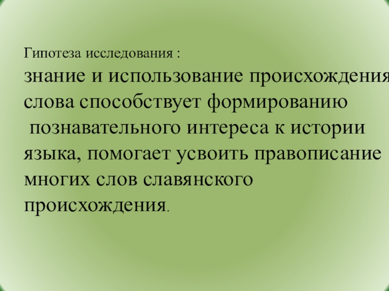 Гипотеза исследования : знание и использование происхождения слова способствует формированию познавательного интереса к истории языка, помогает усвоить
