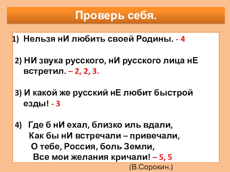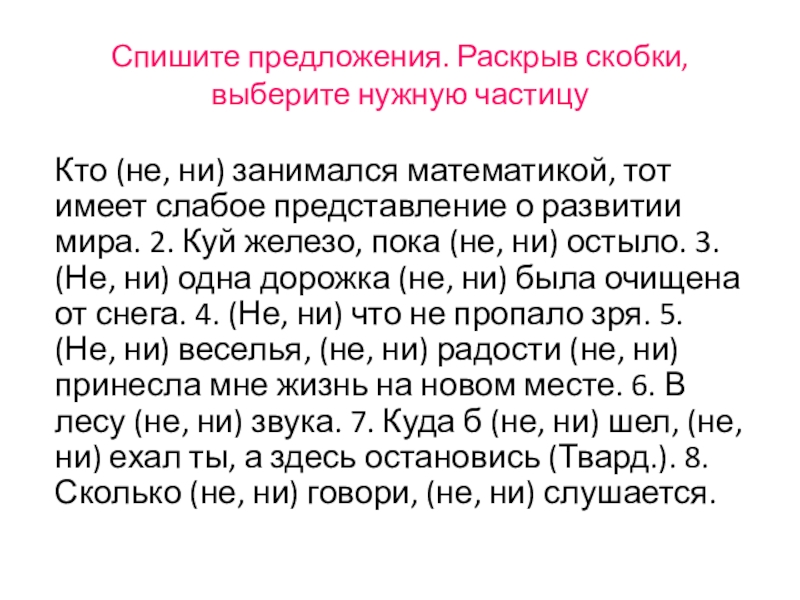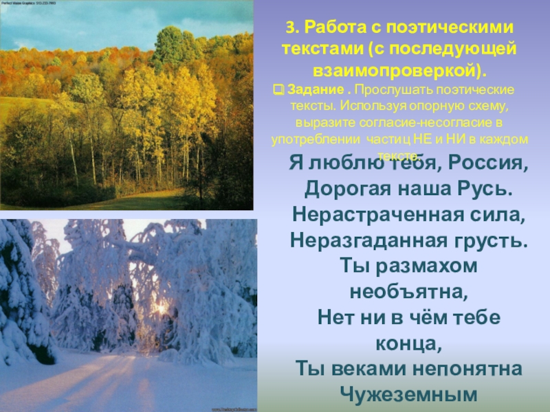 Задание . Прослушать поэтические тексты. Используя опорную схему, выразите согласие-несогласие в употреблении частиц НЕ и НИ в каждом тексте.