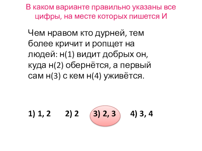 Чем нравом кто дурней, тем более кричит и ропщет на людей: н(1) видит добрых он, куда н(2) обернётся, а первый сам н(3) с кем н(4) уживётся.