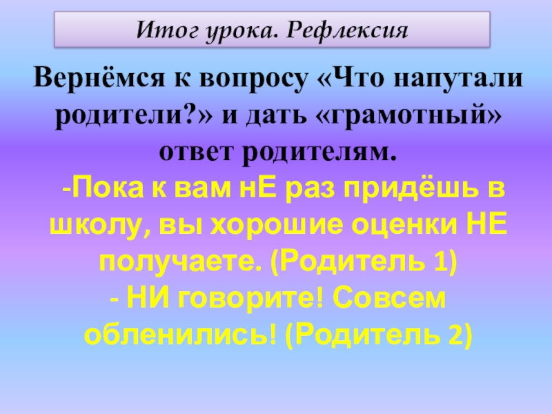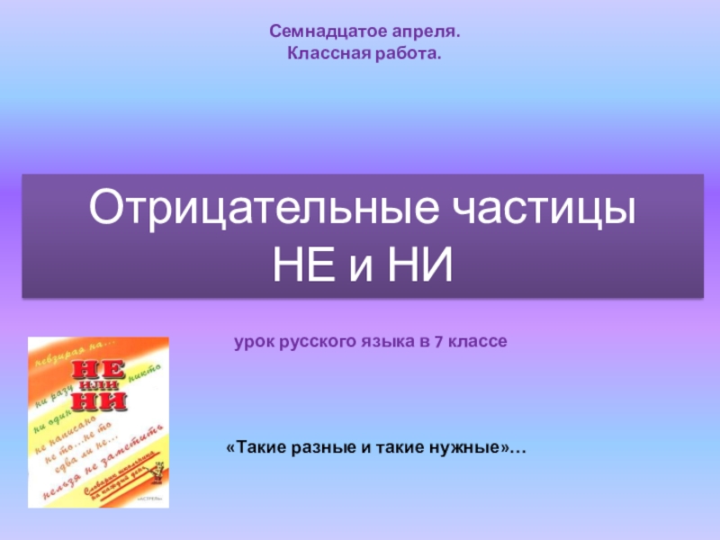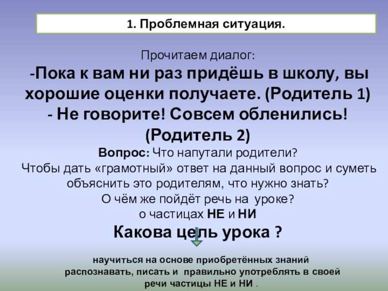 научиться на основе приобретённых знаний распознавать, писать и правильно употреблять в своей речи частицы НЕ и НИ .