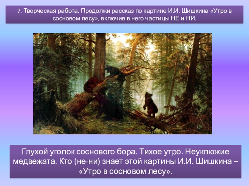 Глухой уголок соснового бора. Тихое утро. Неуклюжие медвежата. Кто (не-ни) знает этой картины И.И. Шишкина – «Утро в сосновом лесу».