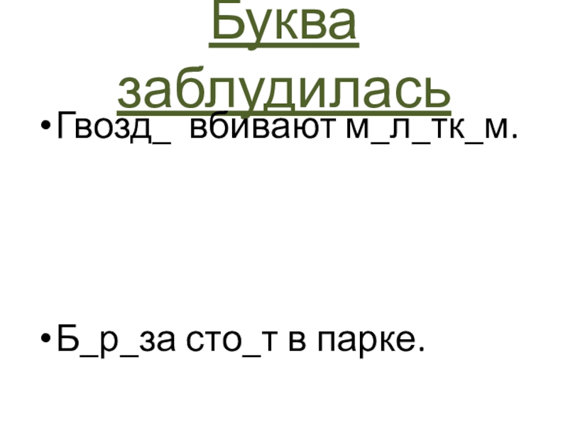 Буква заблудиласьГвозд_ вбивают м_л_тк_м. Б_р_за сто_т в парке.
