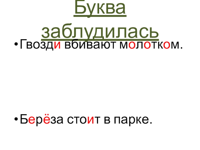 Буква заблудиласьГвозди вбивают молотком. Берёза стоит в парке.
