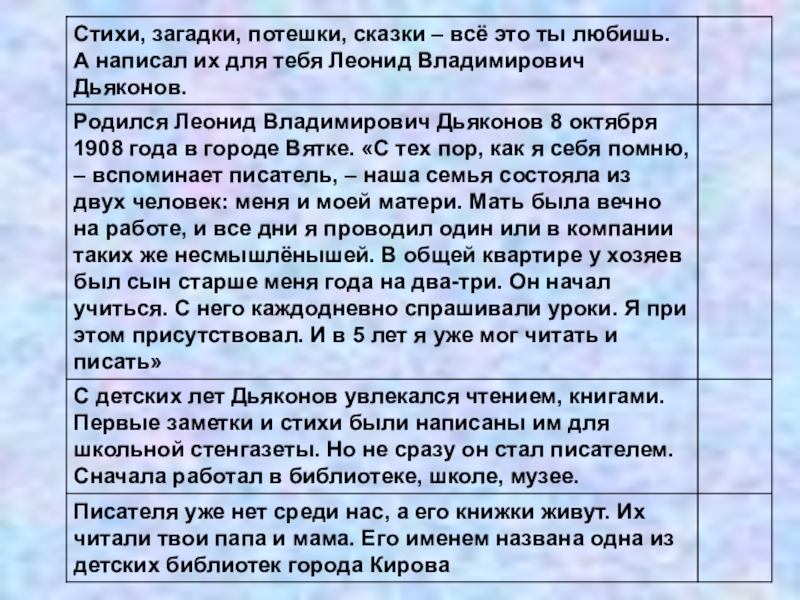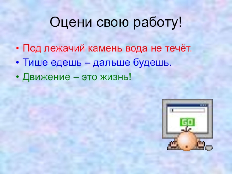 Это сайт презентаций, где можно хранить и обмениваться своими презентациями, докладами, проектами, шаблонами в формате PowerPoint с другими пользователями. Мы помогаем школьникам, студентам, учителям, преподавателям хранить и обмениваться учебными материалами.