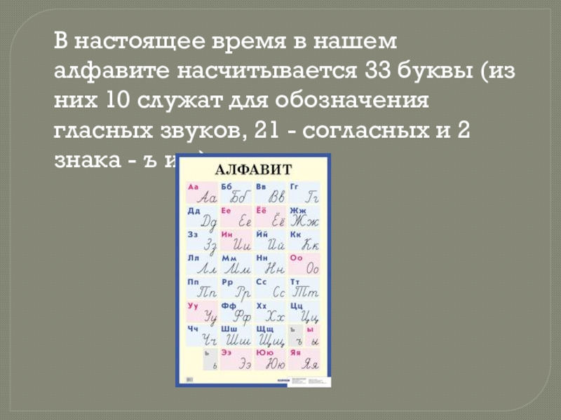 В настоящее время в нашем алфавите насчитывается 33 буквы (из них 10 служат для обозначения гласных звуков,