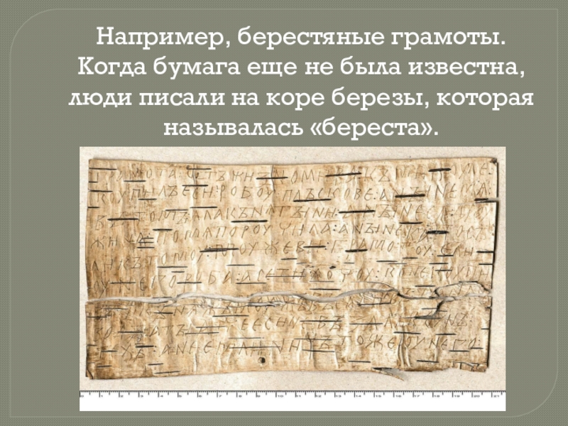 Слайд 6Например, берестяные грамоты. Когда бумага еще не была известна, люди писали