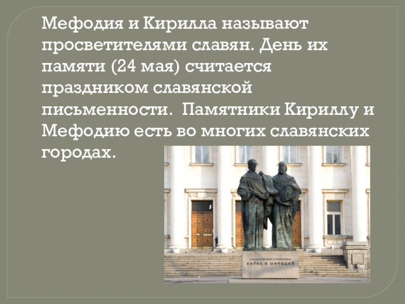 Мефодия и Кирилла называют просветителями славян. День их памяти (24 мая) считается праздником славянской письменности. Памятники Кириллу