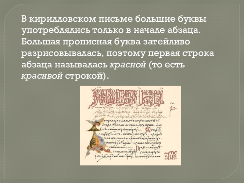 Слайд 19В кирилловском письме большие буквы употреблялись только в начале абзаца. Большая