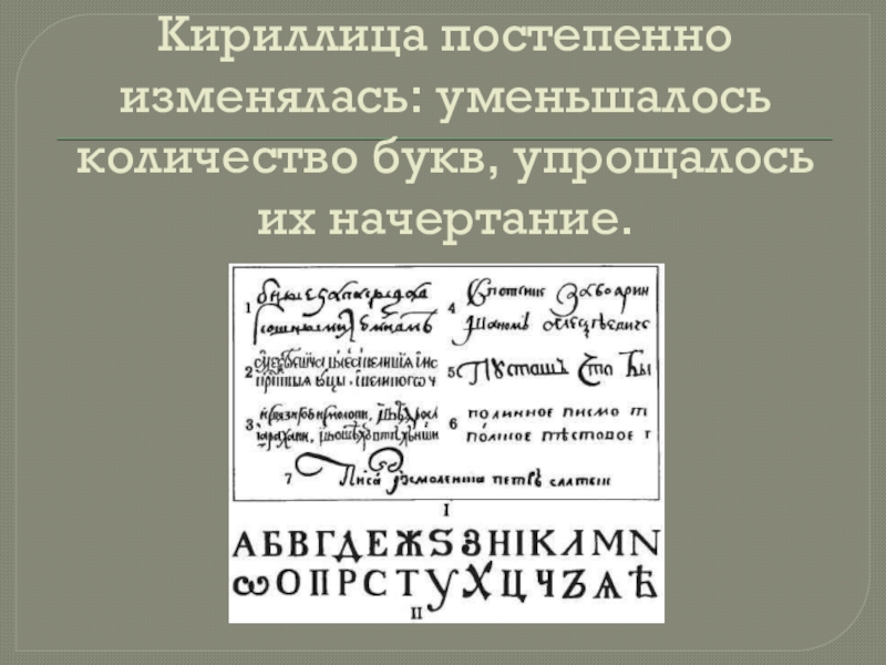 Кириллица постепенно изменялась: уменьшалось количество букв, упрощалось их начертание.