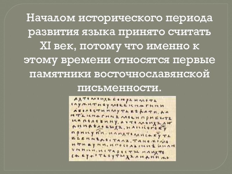 Слайд 4Началом исторического периода развития языка принято считать XI век, потому что