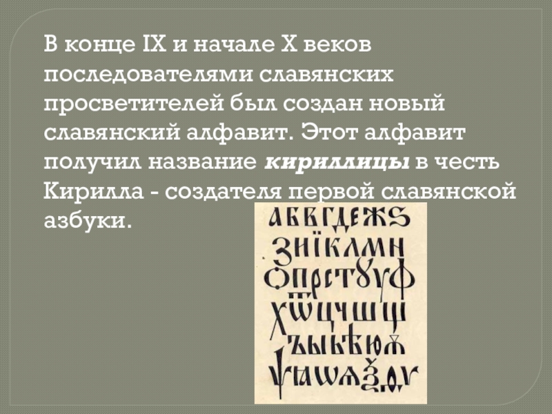 создан новый славянский алфавит. Этот алфавит получил название кириллицы в честь Кирилла - создателя первой славянской азбуки.