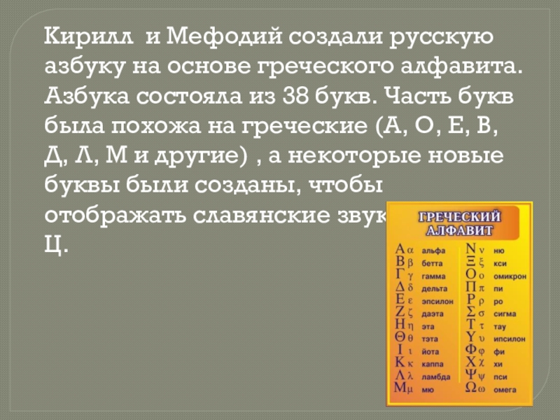 Кирилл и Мефодий создали русскую азбуку на основе греческого алфавита. Азбука состояла из 38 букв. Часть букв