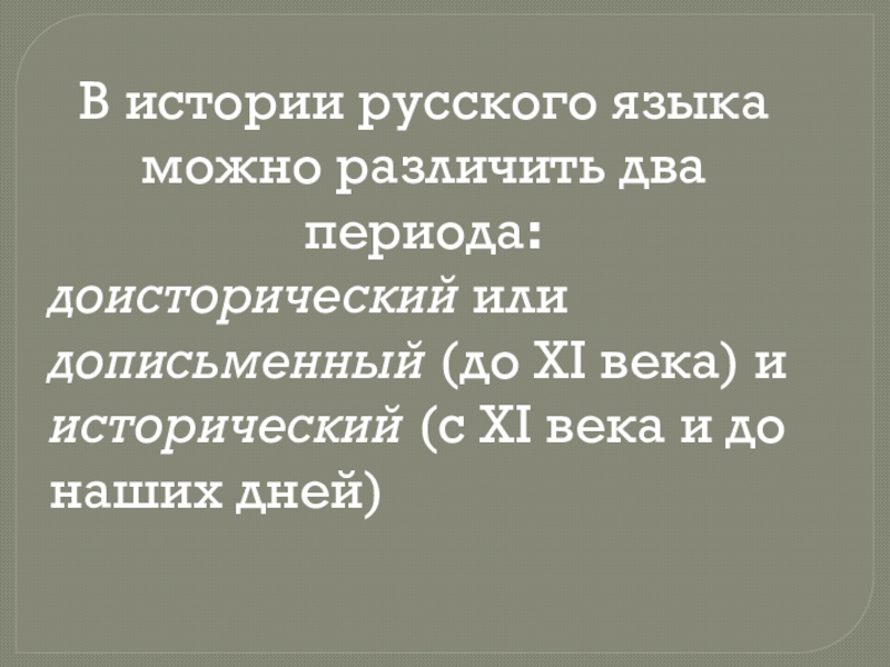 В истории русского языка можно различить два периода: доисторический или дописьменный (до XI века) и исторический (с