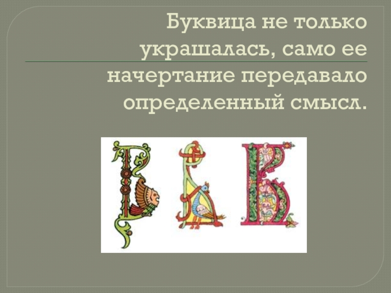 Слайд 22Буквица не только украшалась, само ее начертание передавало определенный смысл.