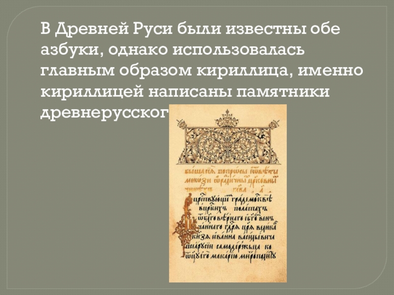 Слайд 14В Древней Руси были известны обе азбуки, однако использовалась главным образом