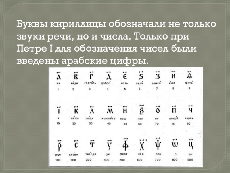 Буквы кириллицы обозначали не только звуки речи, но и числа. Только при Петре I для обозначения чисел