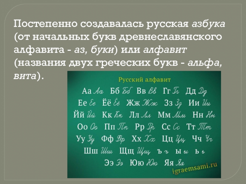 Постепенно создавалась русская азбука (от начальных букв древнеславянского алфавита - аз, буки) или алфавит (названия двух греческих